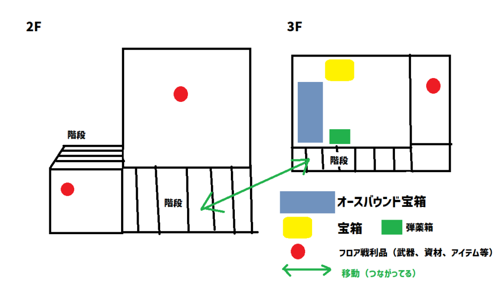 3Dのマップになるとなかなか表現するのは難しいです。そこで今回は、少しレトロ風になりますが、無理やり平面にして2F以上の建築物を対象にどのフロアになんのアイテムがあるかまとめてみました。