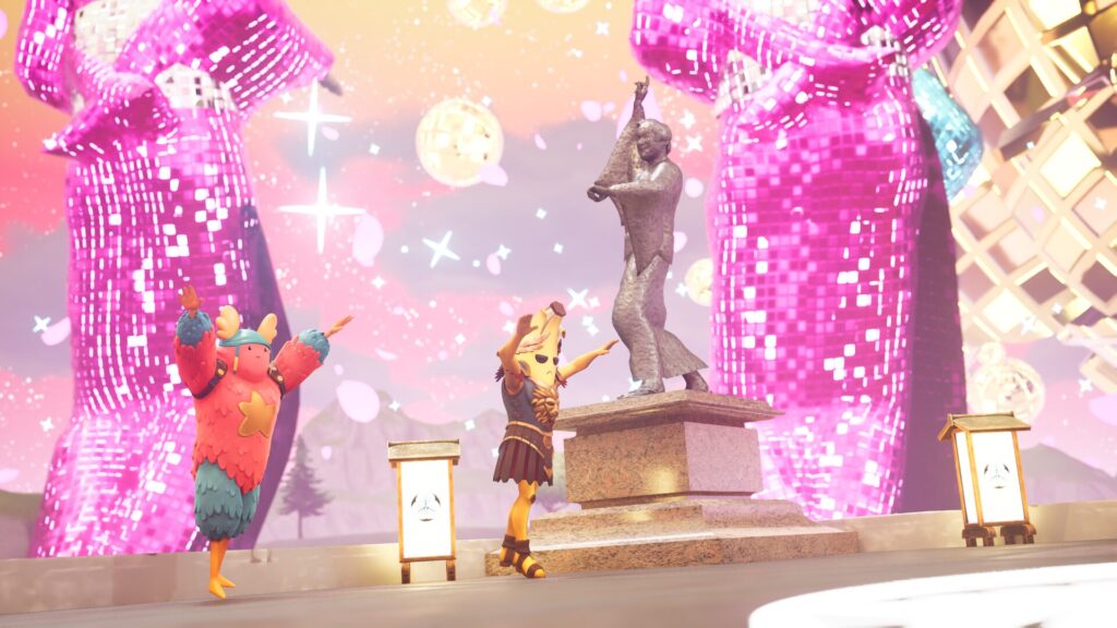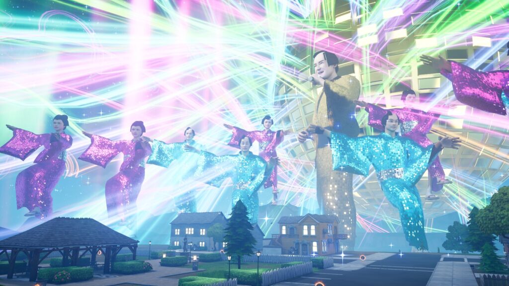 今回は、これまでのフォートナイトで行われたライブパフォーマンスの作法を取り入れつつ、日本で幅広い世代から支持され、長い間愛され続けてきているマツケンサンバⅡがフォートナイトで体験できます。ライブでは、巨大なマツケンがFortniteでお馴染みの4つのエリアに登場します。プレイヤーはマツケンサンバⅡの楽曲世界に入り、他のプレイヤーと一緒にライブを盛り上げ楽しむことができます。