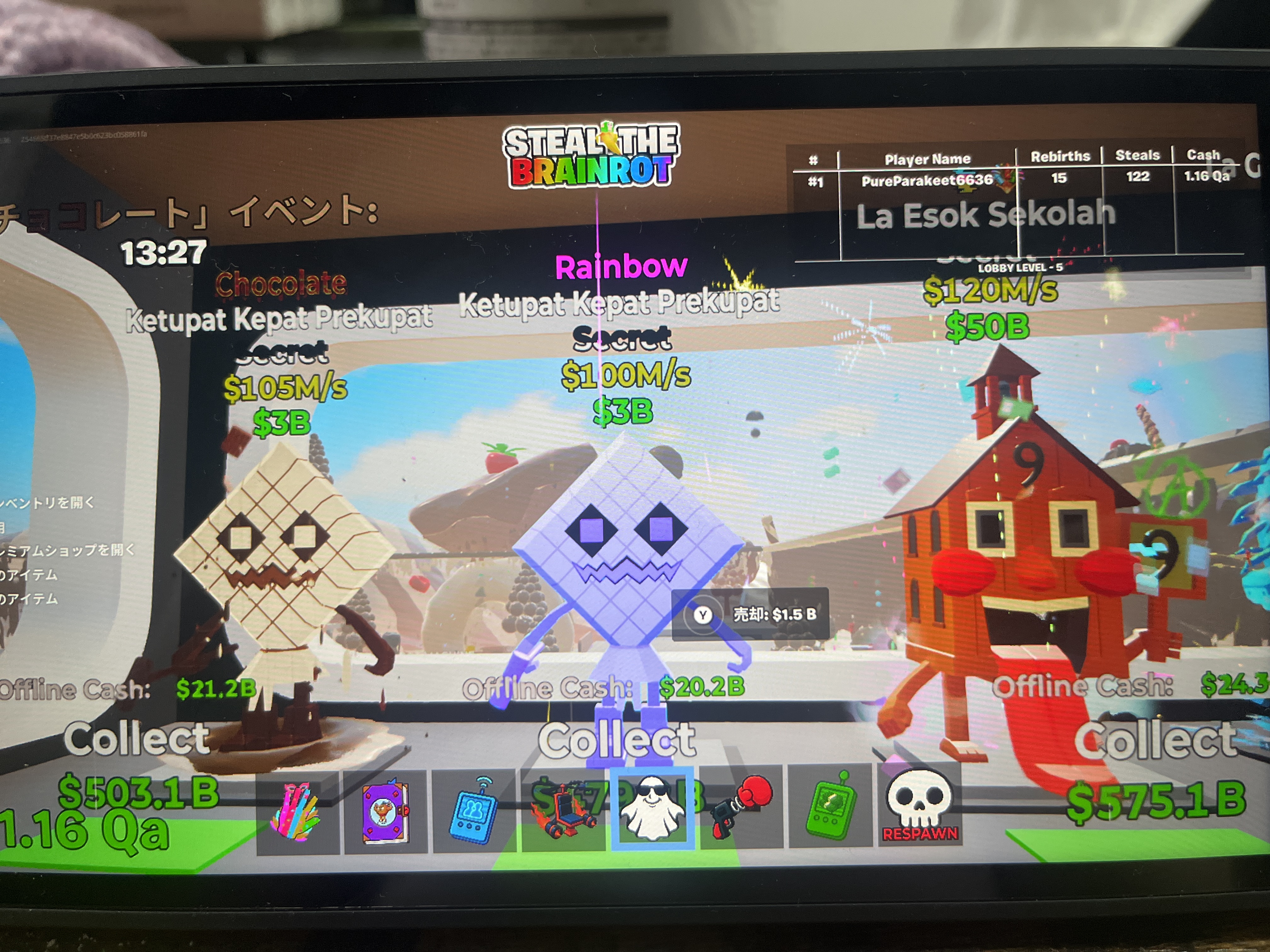 プレイヤーは獲得したブレインロットを使って拠点を成長させ、最終的にはリバース(転生)によって拠点のアップグレードが可能です。リバースを行うことでキャッシュ倍率や拠点に収容できるブレインロットの数が増え、島内で使用できる道具も開放されます。ただし、リバースを実行すると拠点内のブレインロットや資金はすべて消えてしまうため、タイミングには注意が必要です。