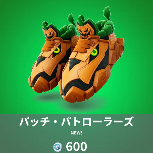 本日のアイテムショップに、フォートナイトオリジナルシューズ「パッチ・パトローラーズ」が登場しています。よく見たら野菜のカボチャでハロウィンにはもってこいです。怪しげな目が光るところがホラーマップで一層目立つかもしれません。