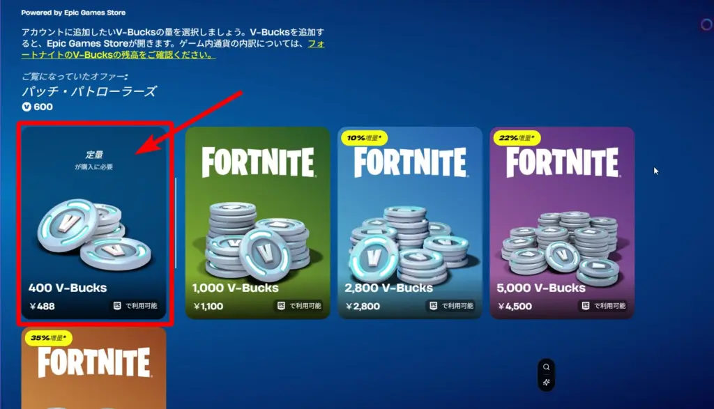 10月14日に新たなV-BUCKSの入手方法として、足りない分だけ購入することができるようになりました。これにより、あと100V-BUCKS足りない場合でも従来通りなら、スターターパックや1,000V-BUCKS等の購入が必要でしたが、100V-BUCKS分の金額だけで済みます。