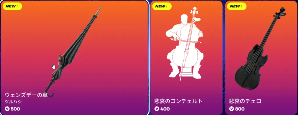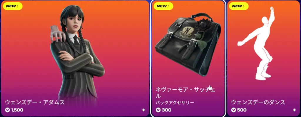 本日のアイテムショップに海外ドラマウェンズデーから主役の「ウェンズデー・アダムス」が登場しています。彼女は頭脳明晰であんまり感情を露わにしない女性です。元々はアダムズファミリーから来ています。