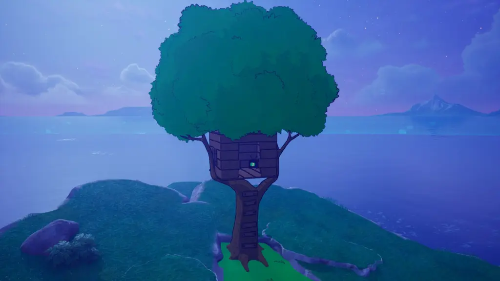 フォートナイトのマップ上で成長が進んでいた木が、遂に完成を迎えました。これまで少しずつ成長していたツリーハウスの苗木がついに大きな木となり、内部に入れるようになっています。