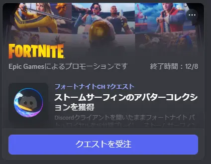 こちらのアバターデコレーションは、Discordを開いた状態でフォートナイトを15分間プレイすることで貰えます。Discordのクエストは2025年12月8日まで利用可能です。