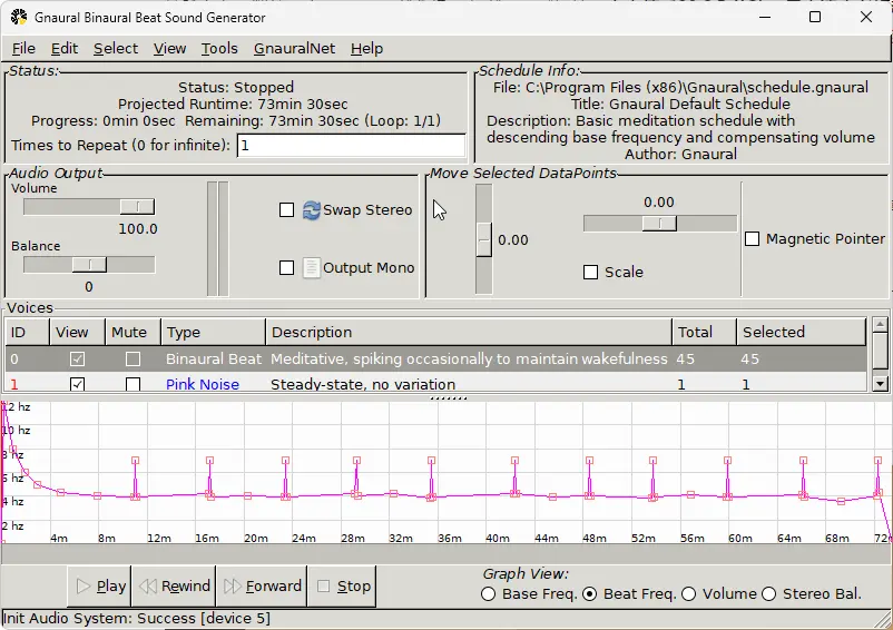 該当のソフトをインストールして、Playボタンを押すだけです。シータ波4Hz-8Hz、アルファ波は8Hz-12Hzなので、変動していることは変動しているが該当のソフトでは変動の幅は思ったよりも小さいです。
