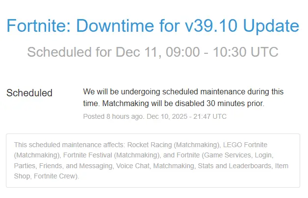Epic Gamesは12月11日、v39.10アップデートを日本時間の12月11日午後6時に実施すると告知しました。