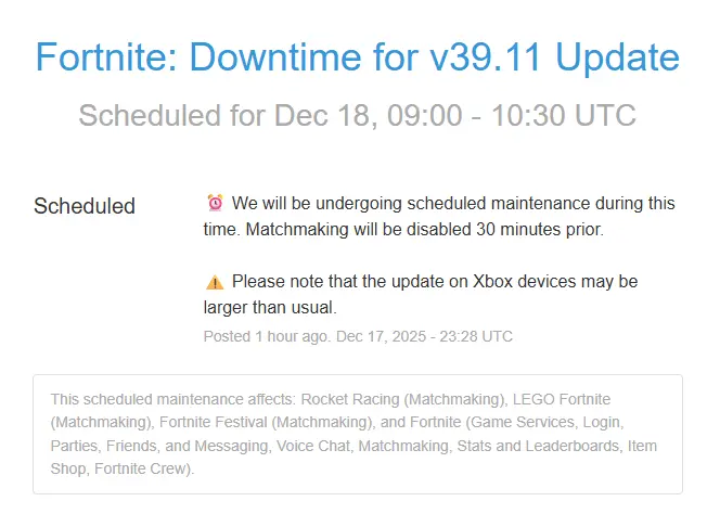 Epic Gamesは12月18日、v39.11アップデートを日本時間の12月18日午後6時に実施すると告知しました。