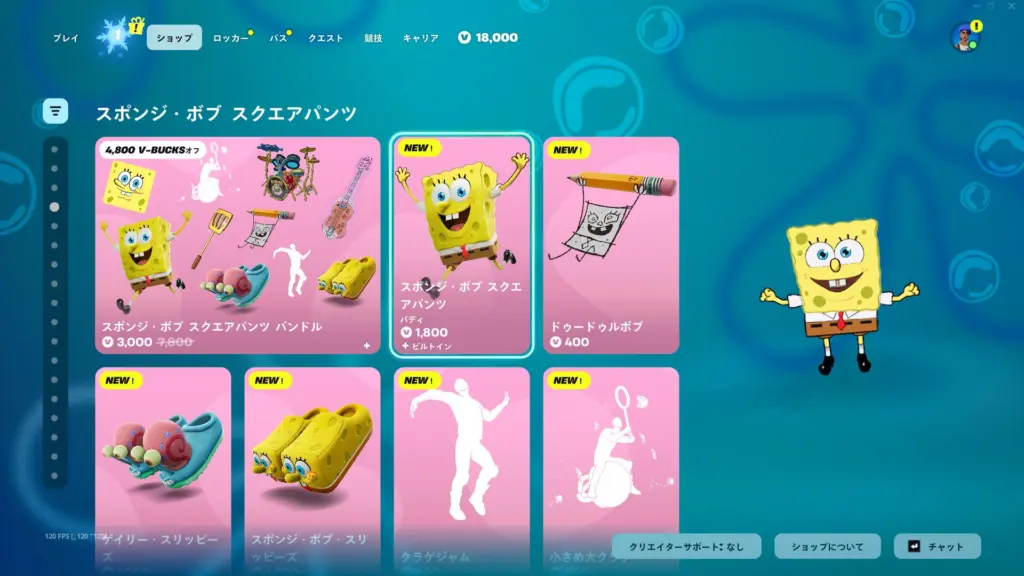 また、「スポンジ・ボブ」コラボも初登場となっており、スポンジ・ボブはバディとして実装。バトル中に一緒についてくるユニークな仕様となっています。あわせて、スポンジ・ボブのパティ・ワゴンや、その他関連アイテムも多数販売されており、コラボ要素を存分に楽しめる内容です。