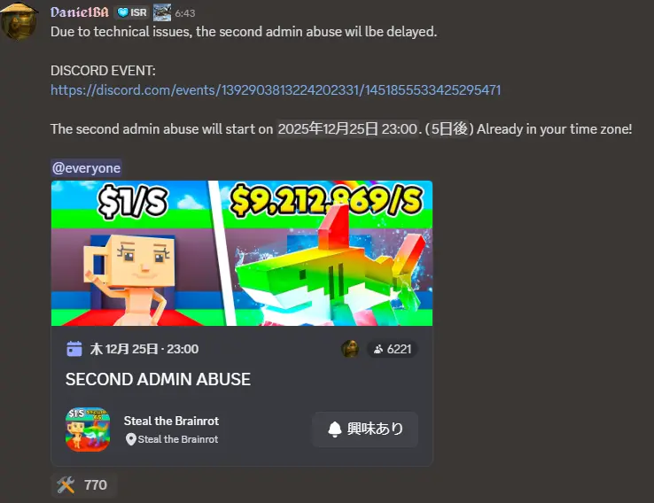 ブレインロットを盗む(STEAL THE BRAINROT)で管理者イベントが12月25日木曜日に延期へ