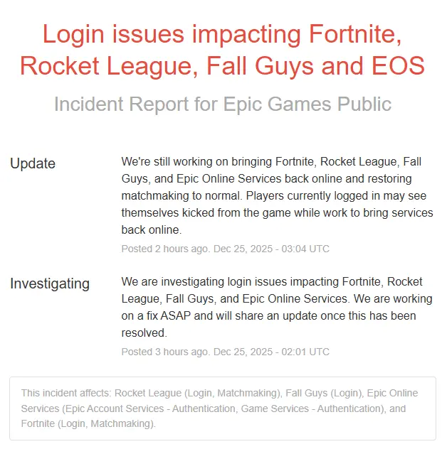 — Fortnite Status (@FortniteStatus) December 25, 2025
