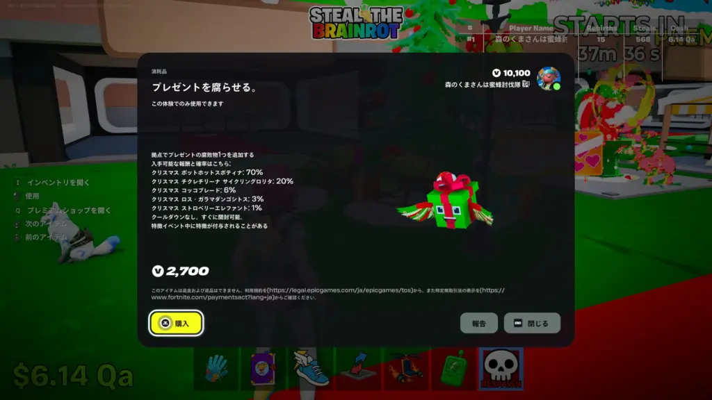 フォートナイトのクリエイティブマップ「STEAL THE BRAINROT(ブレインロットを盗む)」において、島内取引機能が実装されたことが確認されました。