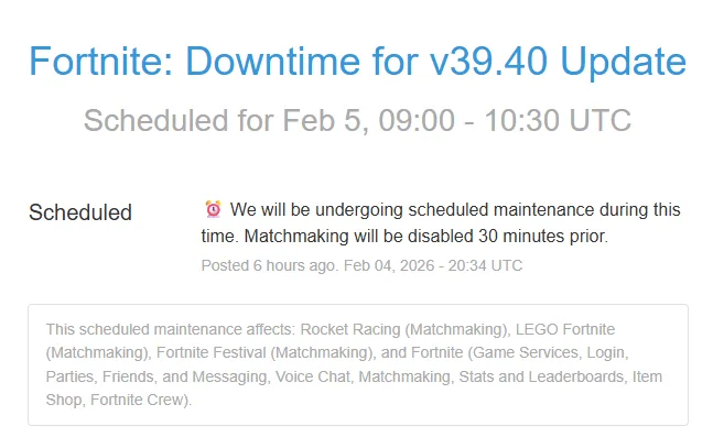 Epic Gamesは2月5日、v39.40アップデートを日本時間の2月5日午後6時に実施すると告知しました。