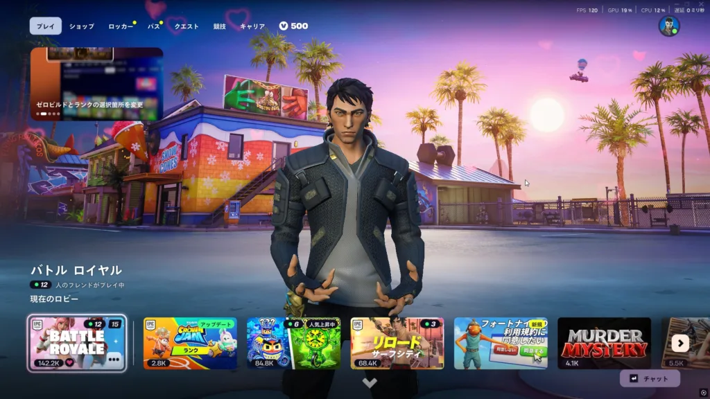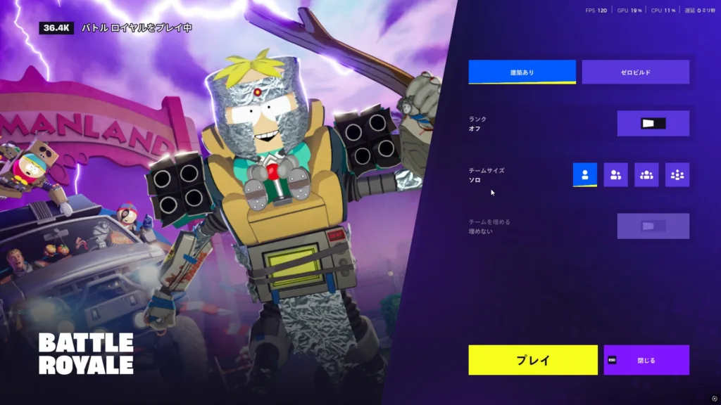 建築あり/ゼロビルド、ランク、チームサイズ、チームを埋める等の設定がバトルロイヤルを選択するとできるように変更になっています。