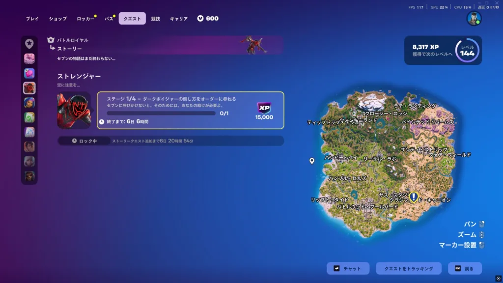 バトルロイヤルを選択したうえでクエストを選ぶと、ストーリークエストの追加が来ています。今チャプターは前半は全然全く進まない印象でしたが、後半になって1週間ごとに新しいストーリーが追加されます。
