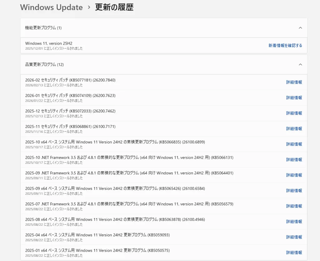 ただし、Windows Updateをこまめに実施し、最新の状態を維持しているユーザーの場合、単独で「KB5074109」を削除できない、あるいはリストに表示されないケースが報告されています。その場合は、関連する後続の更新プログラムを新しい順に遡ってアンインストールする必要があります。
