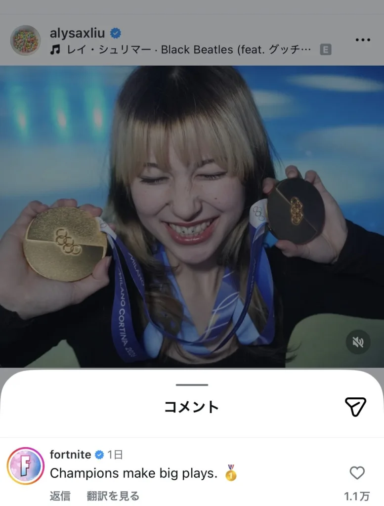 Instagramに投稿されたリュウ選手の五輪での活躍や自身の願いに関する投稿に対し、フォートナイト公式アカウントが放った一言が、コミュニティを熱狂させています。
