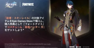 今回のキャンペーンでは、Epic Games Store版の『崩壊:スターレイル』内で対象アイテムを購入することで、フォートナイトのコスチューム「星核ハンター 刃」を実質的な特典として入手することが可能です。