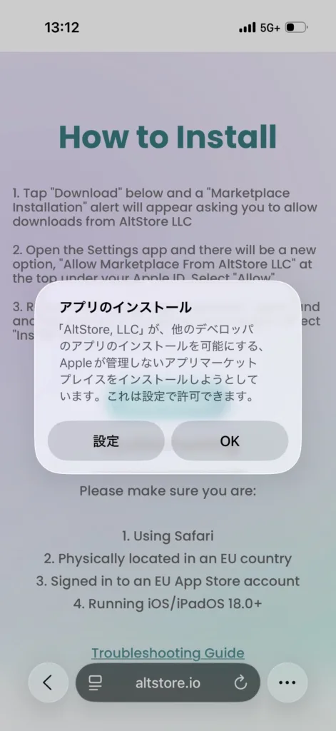 iPhoneのSafariでAltStoreの公式ページにアクセスし、案内に従ってインストールを開始します。