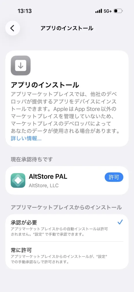 iOSの「設定」アプリを開き、「アプリ」>「アプリのインストール」の項目から、AltStoreによるインストールを個別に許可します。
