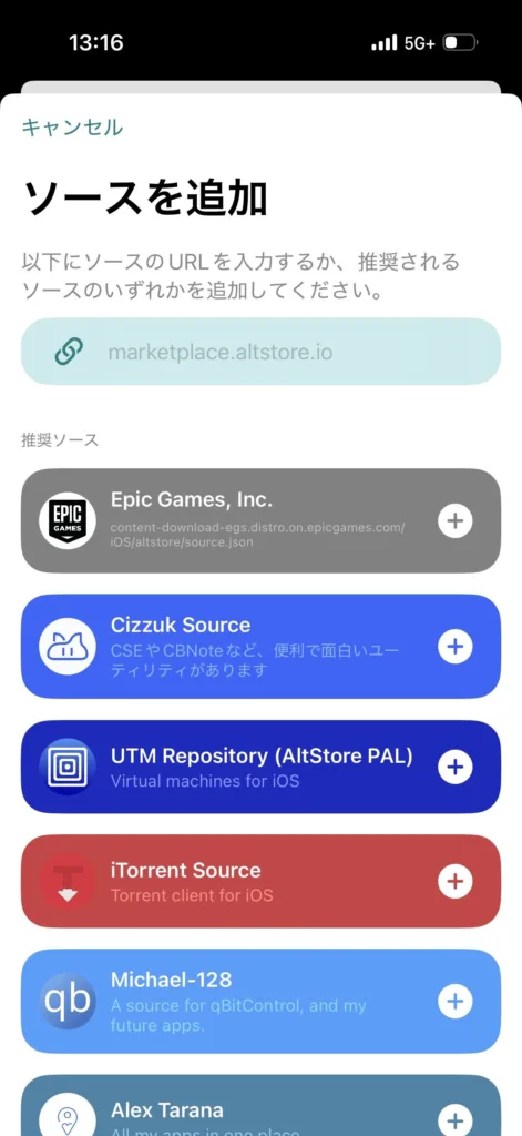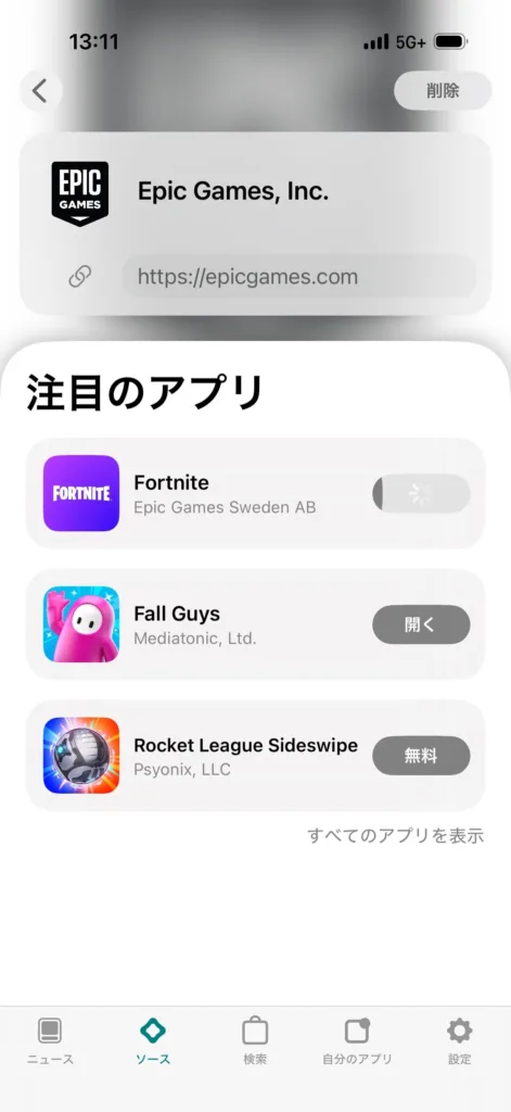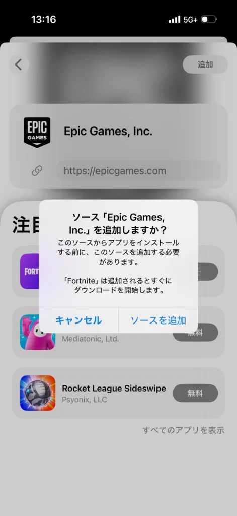 AltStoreアプリを起動後、ソース設定メニューから「Epic Games, Inc.」のソースURLを手動で追加します。