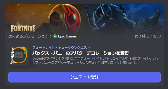 こちらのアバターデコレーションは、Discordを開いた状態でフォートナイトを15分間プレイすることで貰えます。Discordのクエストは2026年3月30日まで利用可能です。