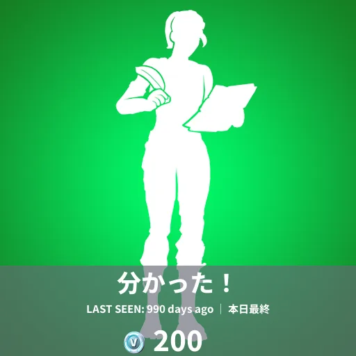 本日のアイテムショップに、エモートの「分かった!」が990日ぶりに再販がされています。前回の再販は、2023年の7月10日です。本日最終になっていることから、1日限定の再販です。